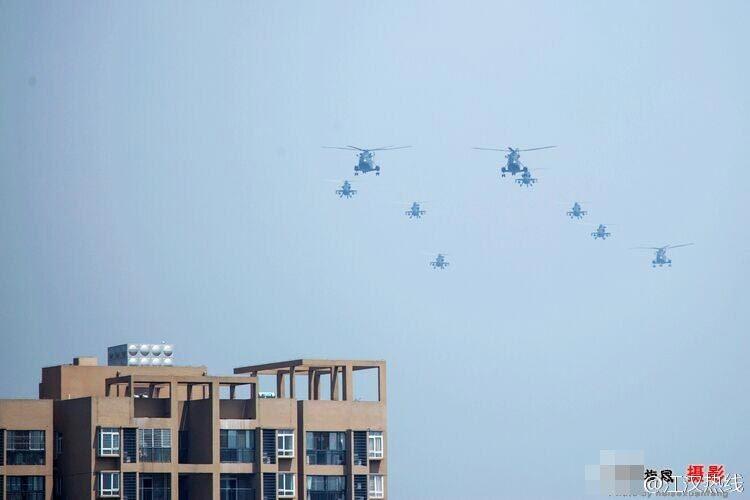 上校阅兵式后经批准率十架直升机绕飞家乡